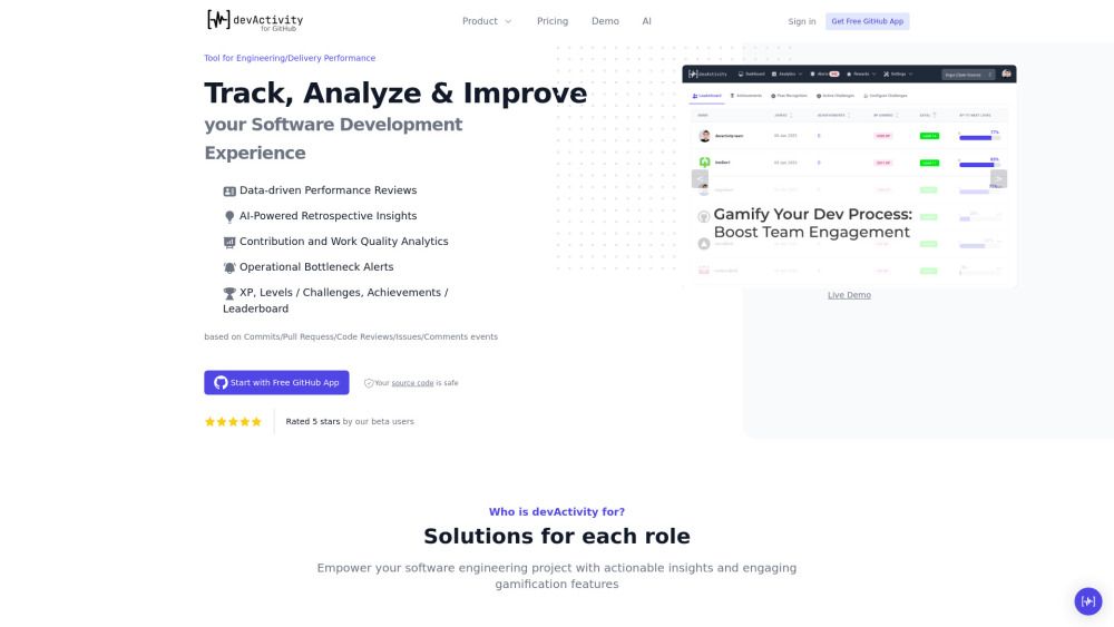 devActivity is designed to empower software engineering projects by providing actionable insights and engaging gamification features. It focuses on enhancing developer experience and engineering performance through AI-powered analytics, allowing teams to track, analyze, and optimize their software development processes effectively.