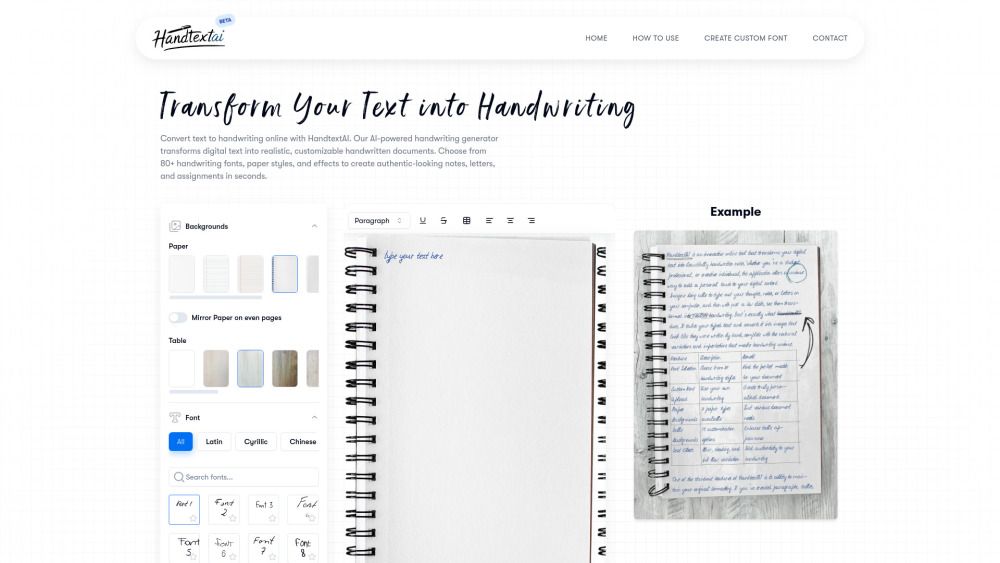 With customizable handwriting styles, various paper backgrounds, and added visual effects, HandtextAI allows for a personalized touch in every project. Experience the charm of handwritten notes without the hassle of pen and paper.