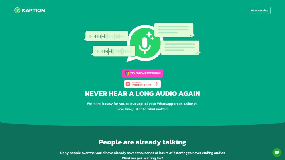 Kaption AI is an innovative platform designed to enhance WhatsApp Business communications by transforming audio messages into text and providing AI-generated summaries. This tool not only saves users valuable time but also boosts productivity by allowing them to focus on what truly matters in their conversations. With thousands of satisfied users, Kaption AI stands out as a top-rated extension that empowers businesses to turn chats into actionable results.