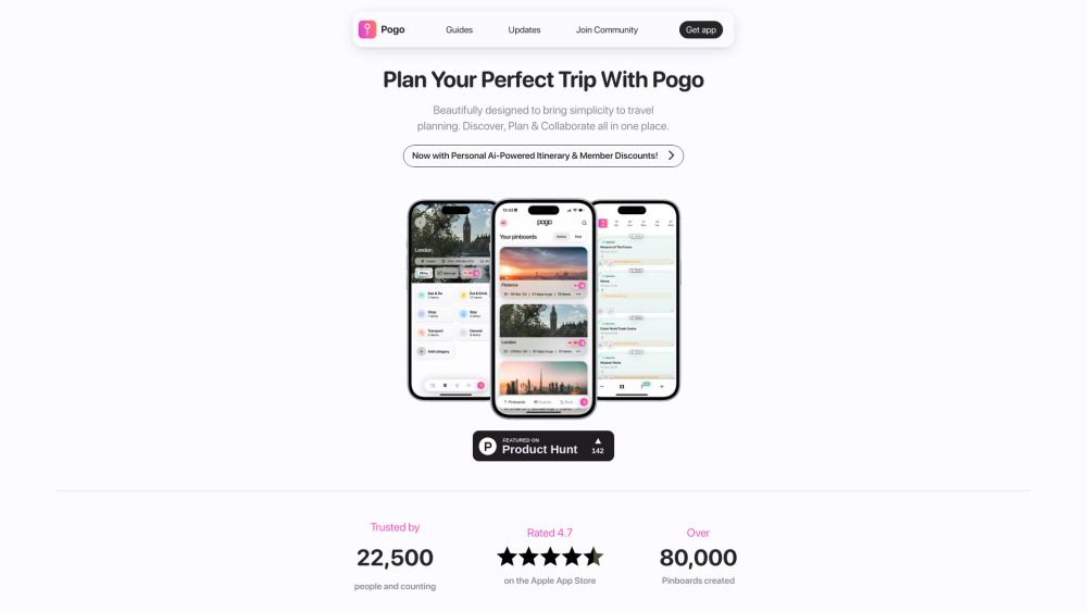 Pogo Travel is an innovative travel planning app that allows users to organize all their trip details in one convenient Pinboard. With features like a day-by-day itinerary and collaborative commenting, travelers can easily plan and discuss their adventures with friends and family. Join a vibrant community of over 60,000 travel enthusiasts and streamline your travel planning experience with Pogo.