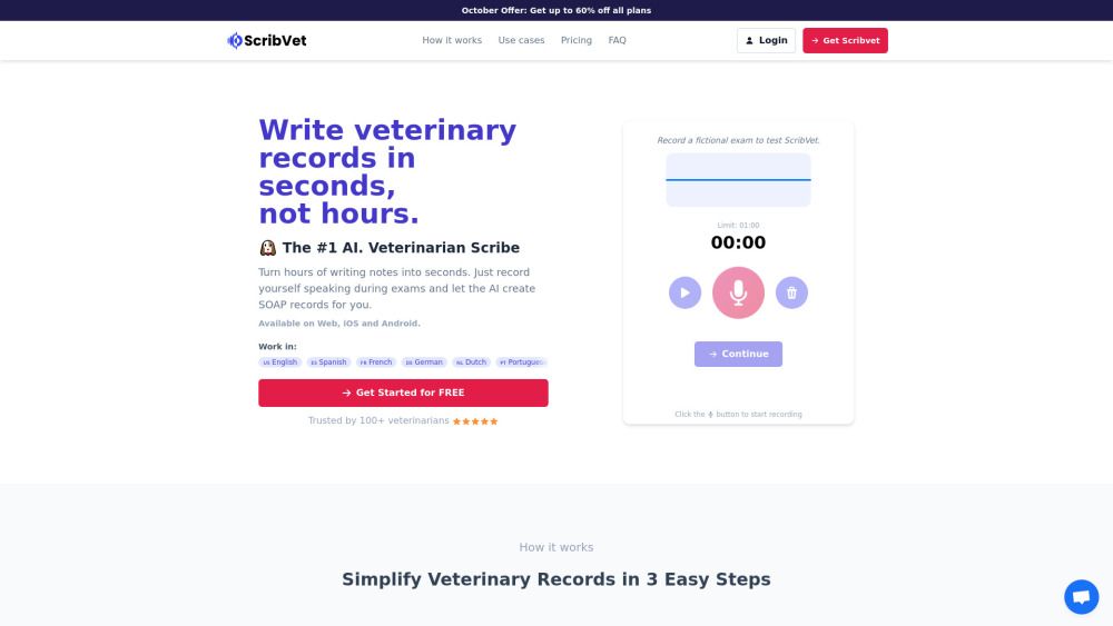 Scribvet is a Veterinary AI Scribe designed to streamline the documentation process for busy veterinarians. By allowing users to record their thoughts naturally during exams, Scribvet automatically generates detailed records, including SOAP notes and client communications, significantly reducing the time spent on paperwork.