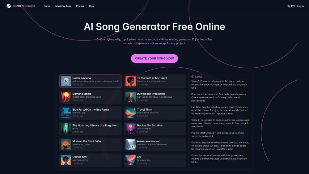 SongGenerator.io is a revolutionary platform powered by V3 API, designed to generate stunning AI music from text inputs. This versatile tool allows users to create music effortlessly by simply inputting song descriptions or lyrics. With its user-friendly interface, SongGenerator.io caters to both novice and experienced users, making it an ideal choice for anyone looking to explore the world of AI-generated music.