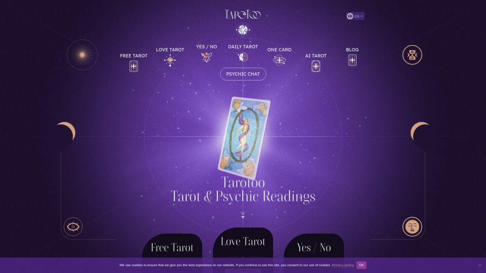Tarotoo is an inclusive online platform that offers free tarot readings, making the wisdom of tarot accessible to individuals from all backgrounds. With personalized readings available for various needs, including general and love insights, Tarotoo empowers users to unlock their potential and navigate life's challenges. The platform is designed for ease of use, ensuring a seamless experience for both beginners and enthusiasts alike.